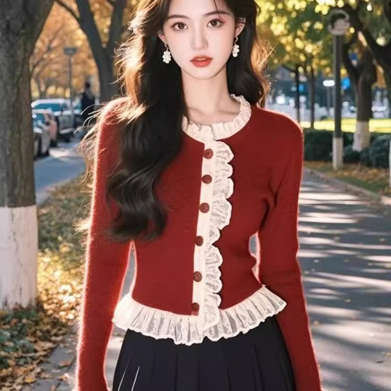 フランスの美しい赤いセーターカーディガン女性の新年着用スリム春ボトムニットトップ