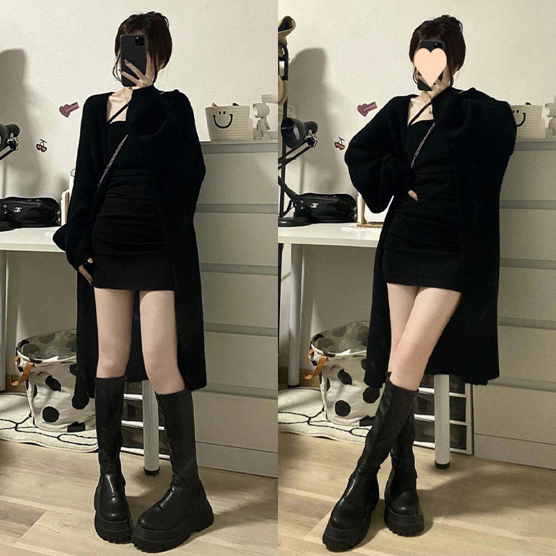 ツーピース/ワンピースミドル丈韓国ニットジャケット+サスペンダースカートタイトヒップスカートスーツ女性用