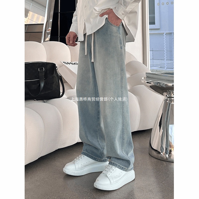 [ファッションを簡単に始める] 男性と女性のための夏の薄いジーンズ、カジュアルで多用途、ゆったりとした明るい色のレトロなドレープストレートパンツ