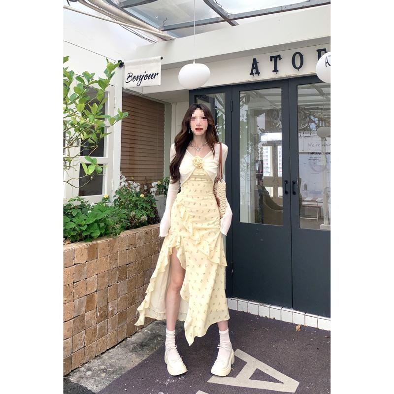 【店頭売れ筋】初秋花柄サスペンダーイレギュラーワンピース新作フレンチスイートウエストスカート2点セット