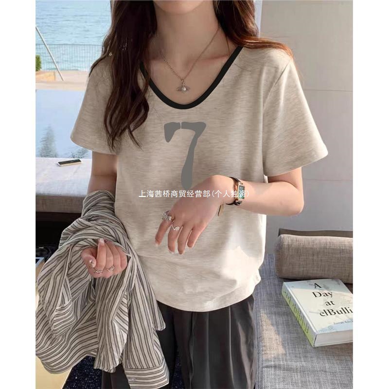 2025 新しい夏の大きいサイズファットミリメートルカジュアル小さな V ネック半袖 Tシャツ女性のベージュグレーインナーショルダープリントトップ