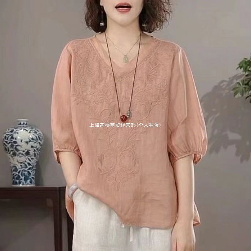 高級婦人服夏のレトロスタイル綿とリネン半袖トップシャツ女性のゆったりとした大きいサイズの刺繍入り薄手のシャツ
