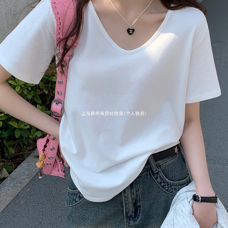 夏 V ネック怠惰なルーズショルダートップ白半袖 T シャツ女性のための 2025 新しいホットスタイル無地インナー