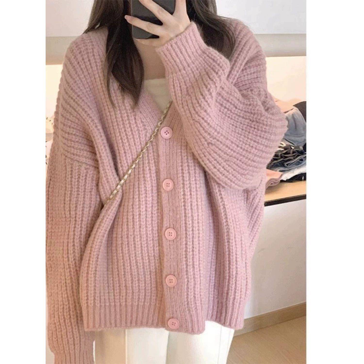 ピンクのセーターのカーディガンの女性学院のスタイルは優しくて怠惰な風が甘くてゆったりしています。