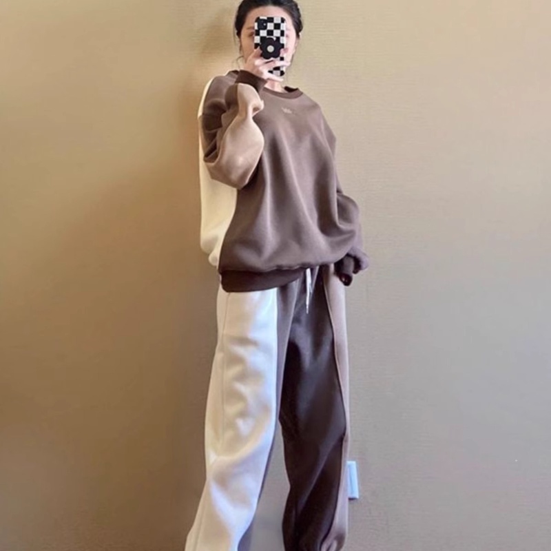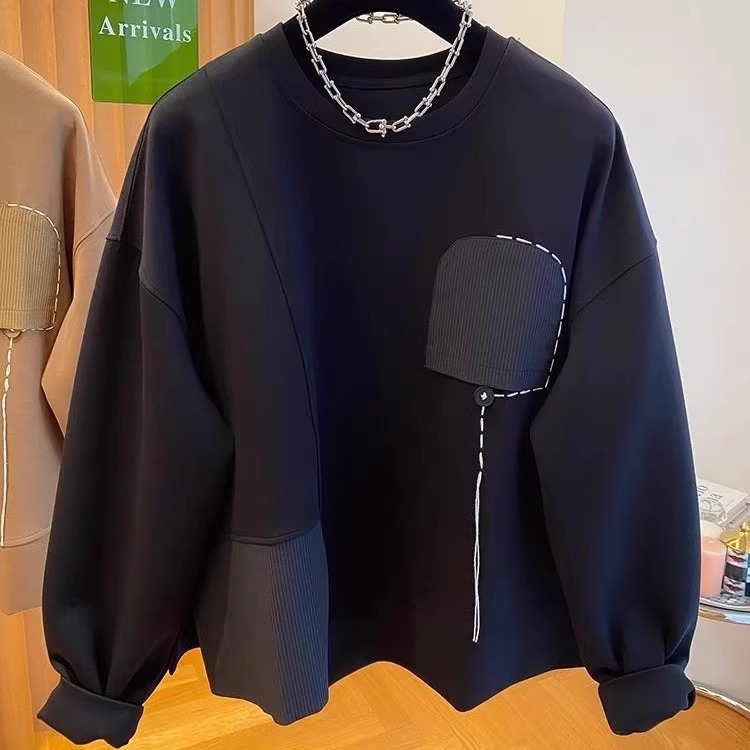 春と秋の大きいサイズの斤の韓国版の不規則なつづりは丸首の衛衣の男女の太っているゆったりしているカップルの上で服を結びます。