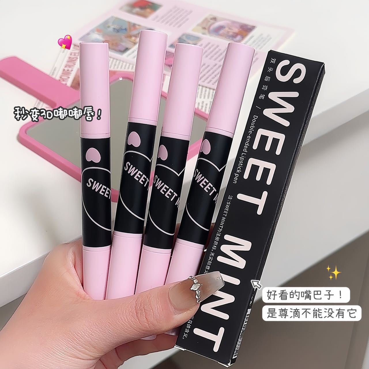 Sweetmintダブルヘッドのリップクリームのリップクリームの二合一の唇の形の霧の顔のつや消しのダブルヘッドのリップの線のペン