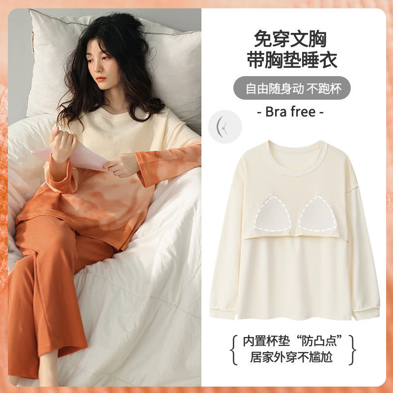 女性用春秋パジャマ、ラウンドネック長袖ズボン、ワッフル純綿アウターウェア、胸パッド付き、膨らみ防止綿パジャマ