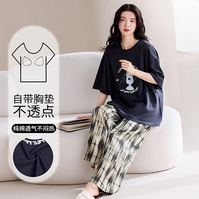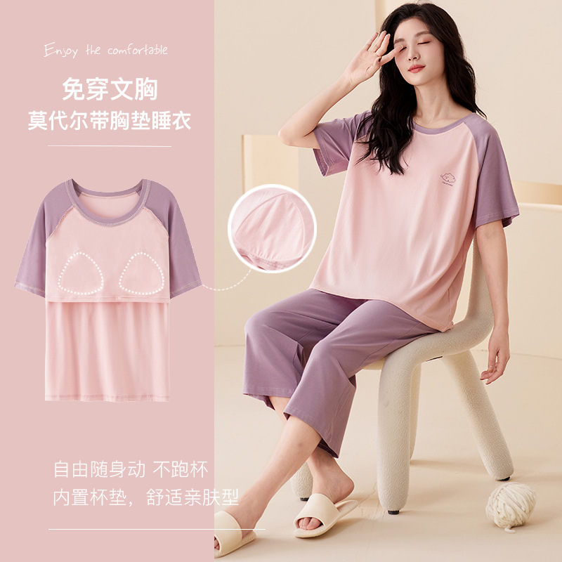 2025 夏パジャマ女性の胸パッド抗膨らみモーダルホーム服ルーズ半袖クロップドパンツセット
