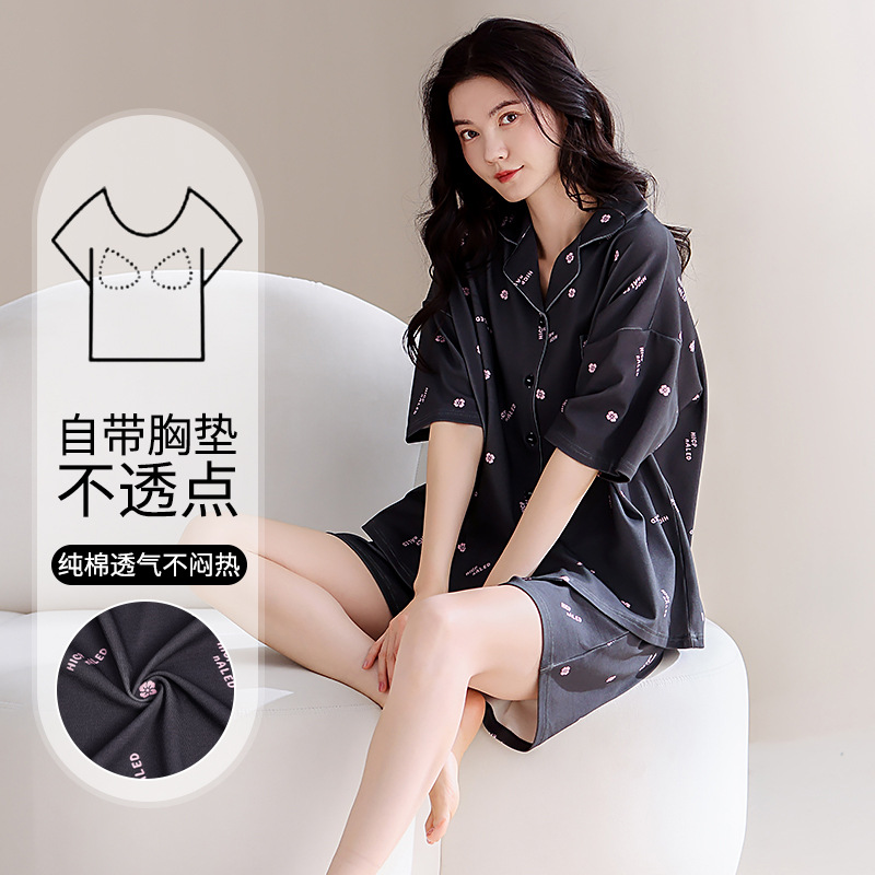 夏のパジャマの女性のカーディガンの半袖の半ズボンの純綿の外は胸のパッドの凸点の少女の大きいサイズの部屋の服を着ます。