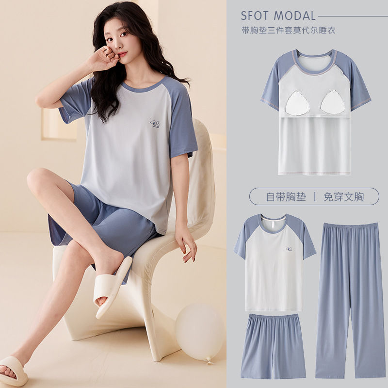 胸パッド付きレディースパジャマ3点セット、外でも着られるモダールゆったりホームウェア、半袖ショーツ、パンツセット