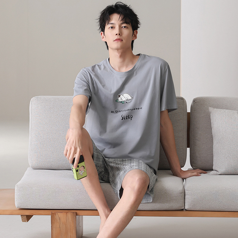 夏用モーダルパジャマ、メンズラウンドネック半袖ショーツ、涼しい空調服、夏のティーンエイジャーのホーム服