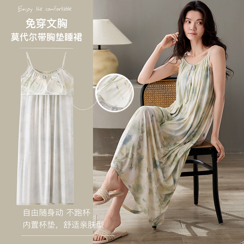女性用サマーパジャマ、モーダルサスペンダー、ノースリーブ、胸パッド付き、膨らみ防止、屋外で着用可能、ロングドレス、女の子用パジャマ