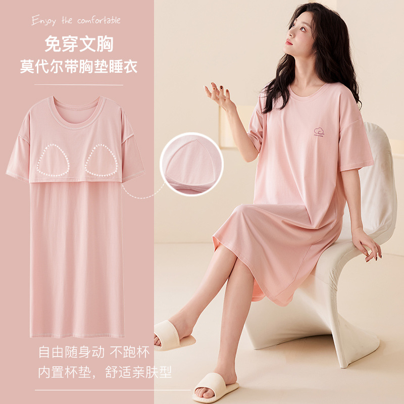 モーダルナイトガウン レディース 夏 ラウンドネック 半袖 胸パッド付き 膨らみ防止 涼しいガールズドレス 空調服 パジャマ