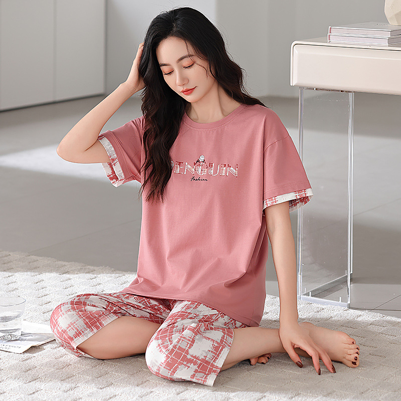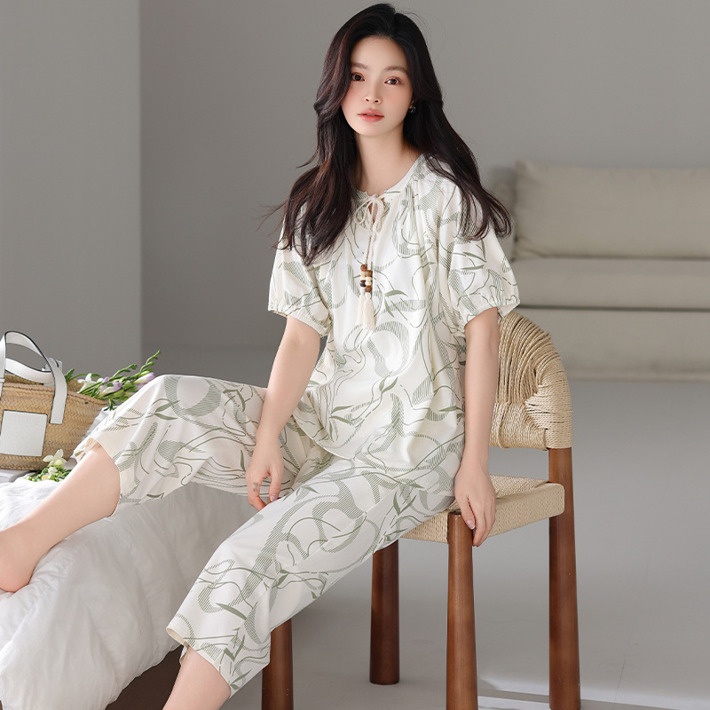 クロスボーダー夏の新製品女性用パジャマコーマ綿半袖クロップドパンツ薄手のゆったりとしたホームウェアとホームウェア