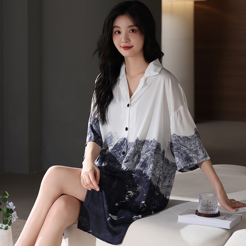 夏のアイスパジャマ女性カーディガン半袖グラデーション風薄いシルクの涼感は少女の家の寝スカートを着ることができる