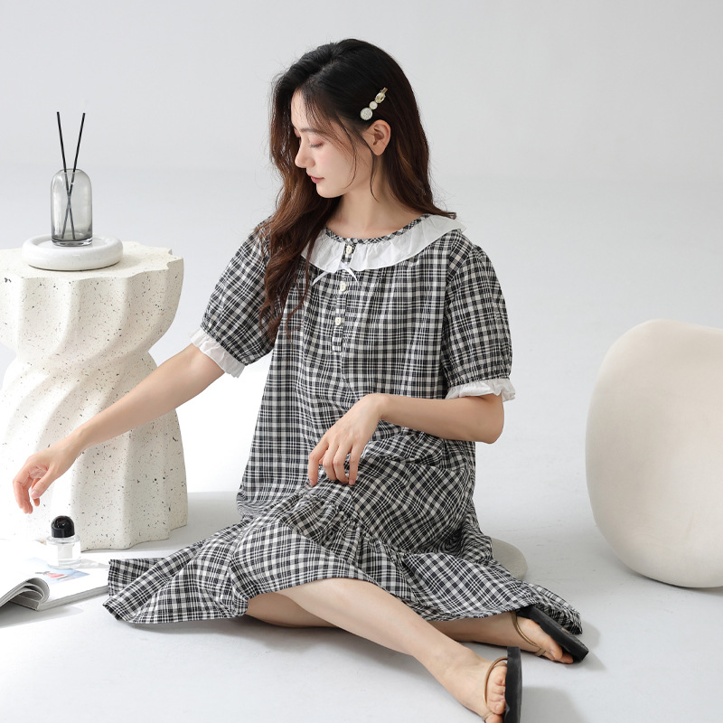 布帛の寝スカートの女性の夏の半袖の中で長い綿の少女の半袖の寝スカートの夏の格子の綿のエアコンの服