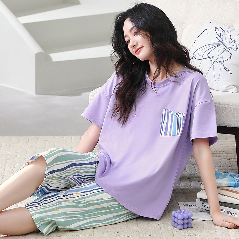 甘い丸首純綿パジャマ女性半袖七分ズボン夏のカジュアル通気綿家庭服セットは外着ができます。