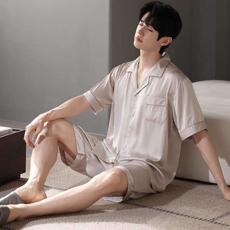 アイスシルクパジャマメンズサマーカーディガン半袖ショーツグラデーション薄いクールシルク空調服メンズホーム服