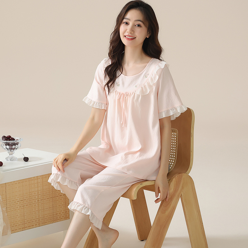 宮廷風パジャマ女性夏半袖丸首薄い雲綿布帛女性純色長ズボン家庭パジャマ