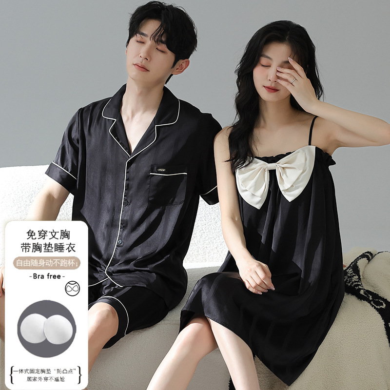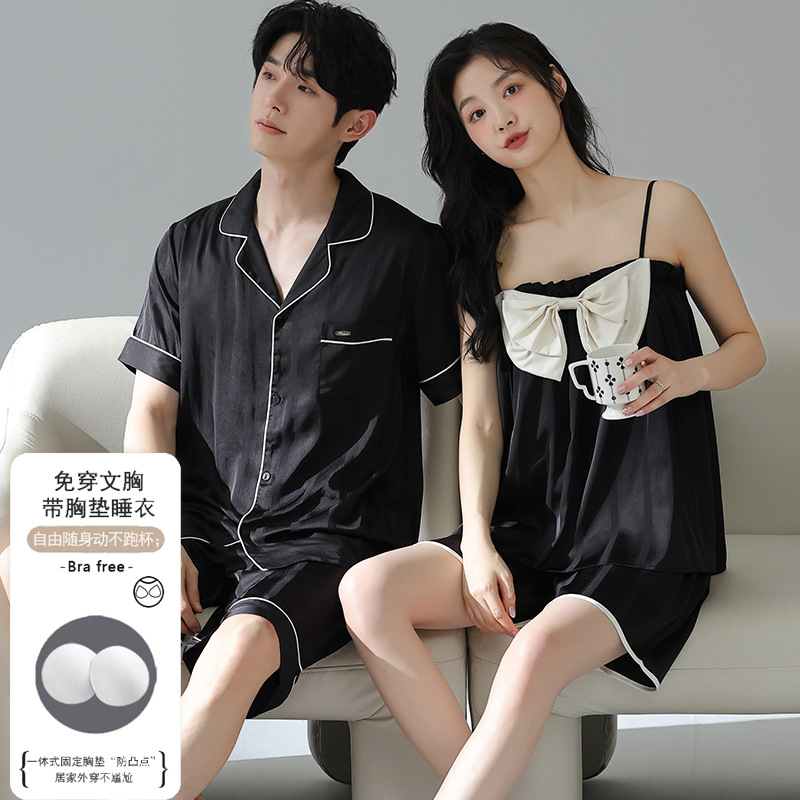 2024夏カップルパジャマ半袖ショーツ胸パッド付き床落ちあ氷糸アンチバンプ夏レディースパジャマ