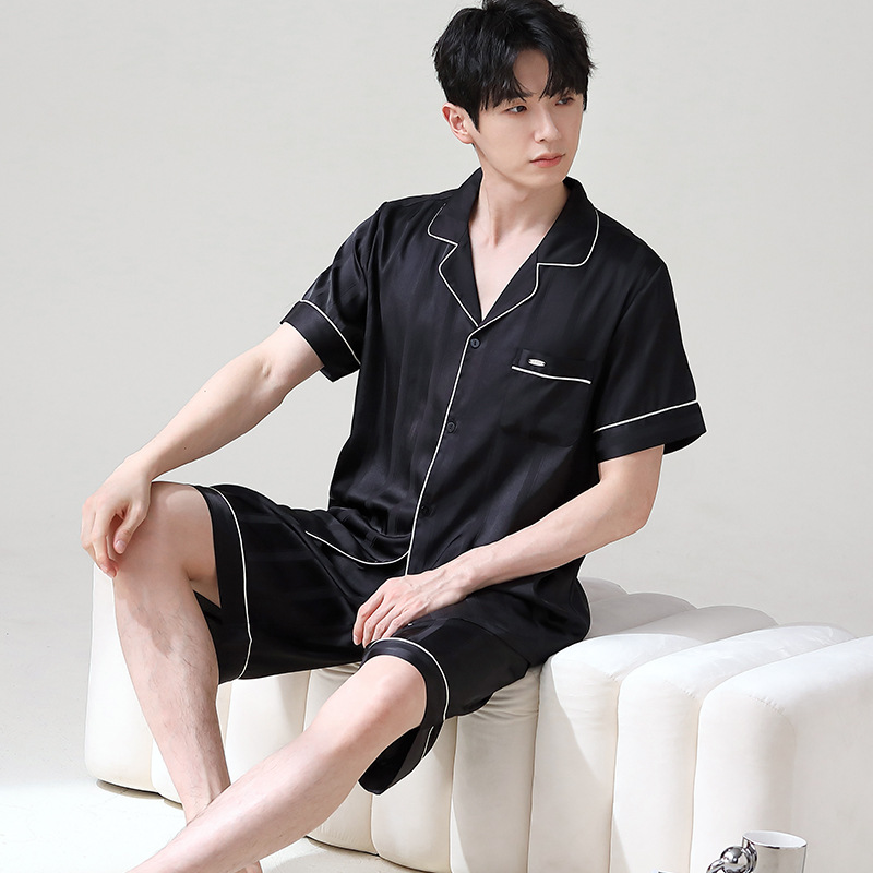 夏のパジャマの男性は襟をめくって半袖の半ズボンの氷の糸の贅沢な薄い金のさわやかな外は青少年のシルクの部屋の服を着ます。