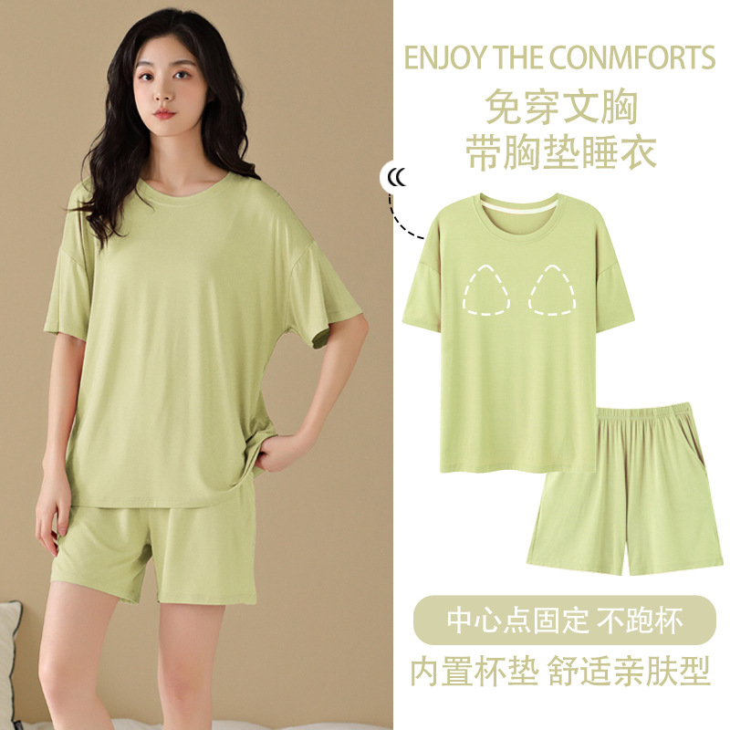 モーダル夏パジャマ女性丸首半袖半ズボン胸パッド付き薄いサイズの少女ホーム2点セット