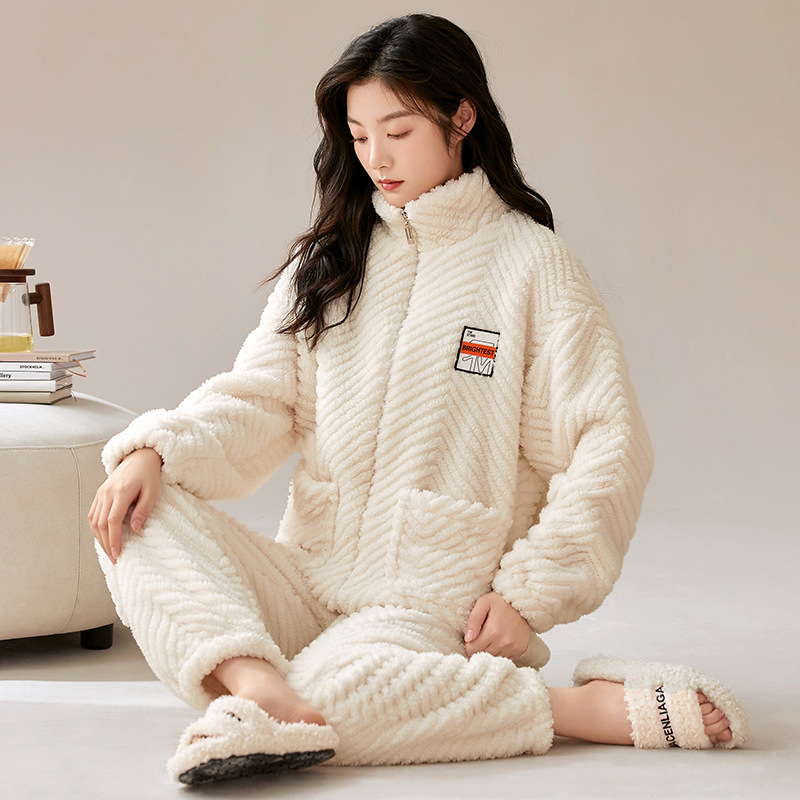 ベルベットのパジャマ女性の冬のスタンドカラーのジッパー長袖の暖かい外着少女フランネルの純色のホームウェアのパジャマ