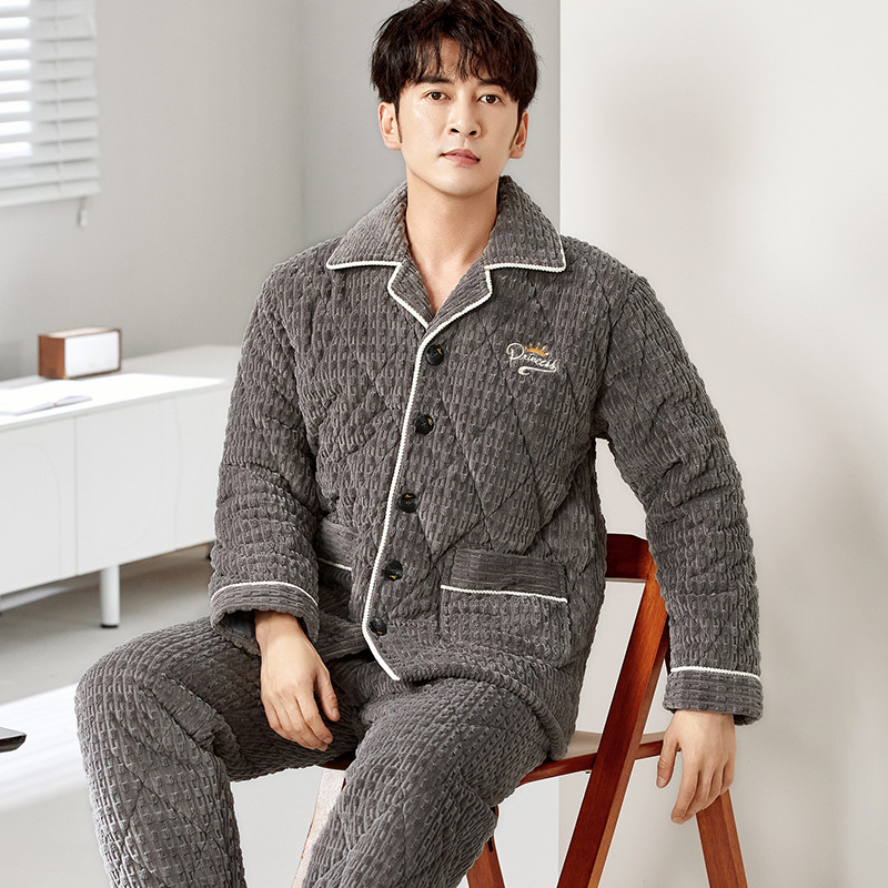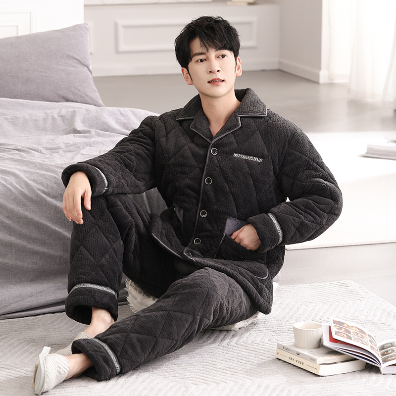 青少年パジャマ冬の半端パイル長袖保温シンプルな大サイズの外着カジュアル着物襟男性ホームウェア