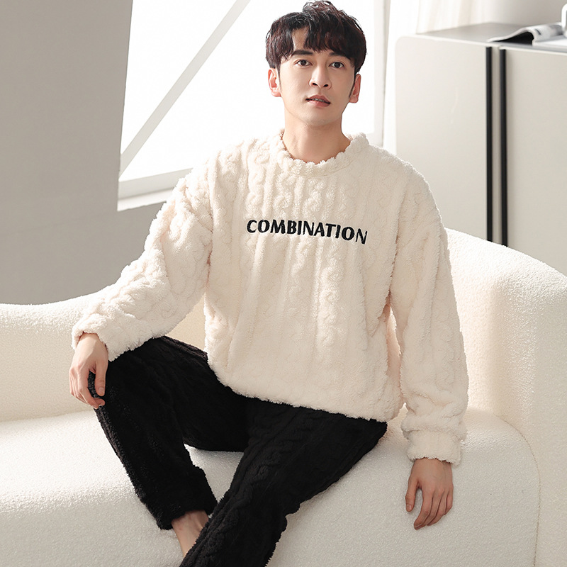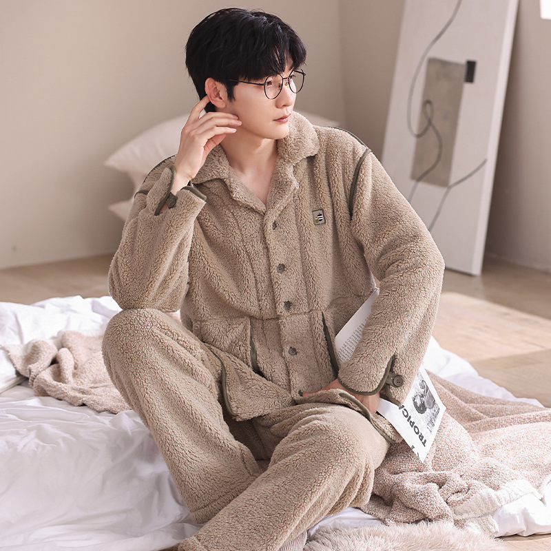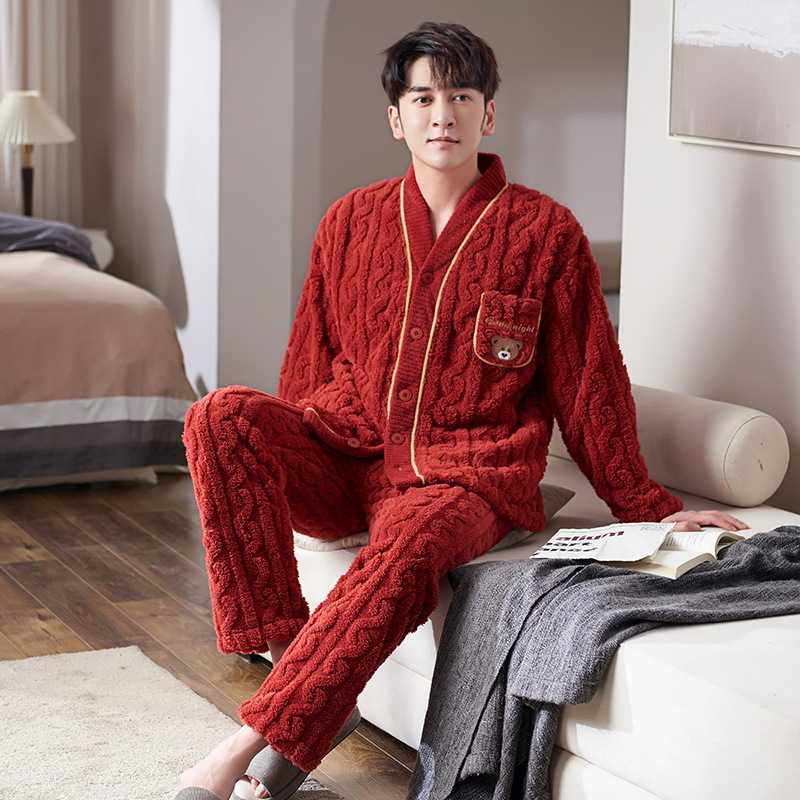 青少年パジャマ冬カーディガン保温コーラルフリース外着フランネル厚手メンズ長袖ズボンホームウェア