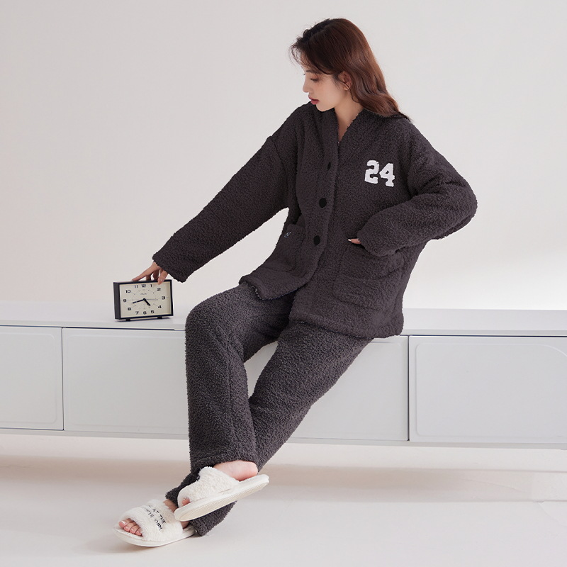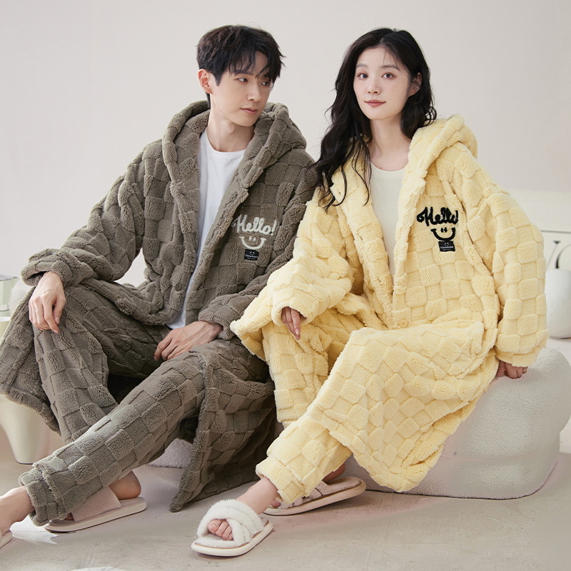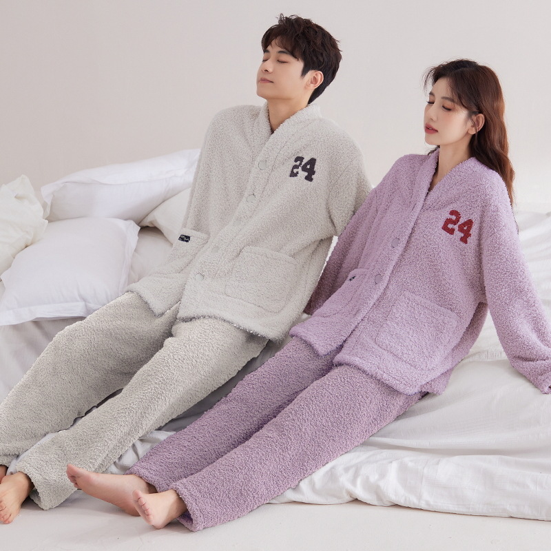 半端パイル冬カップルパジャマカーディガン着物襟カジュアル保温可外着長袖フランネルホームウェア