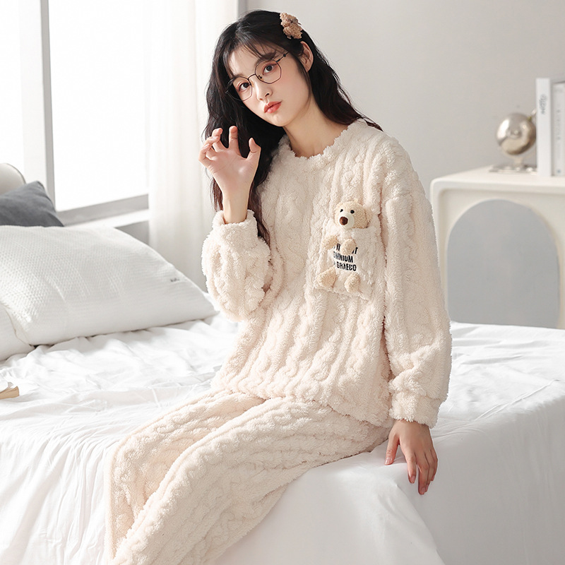 パジャマセット女性秋冬丸首長袖長ズボン漫画サンゴのベルベットが厚くて暖かい外に少女の家の服を着ている