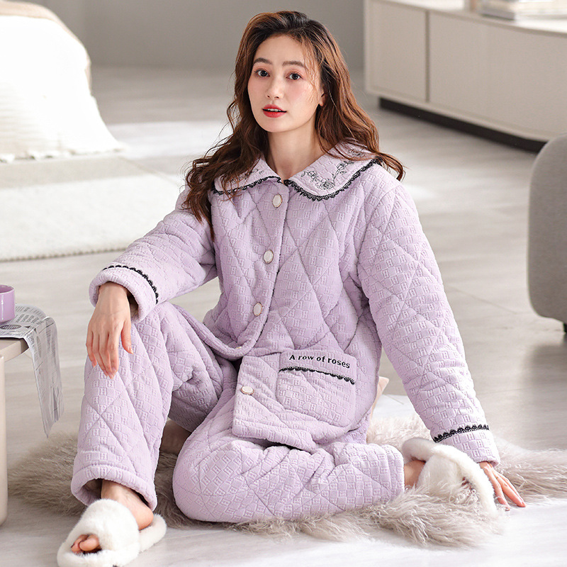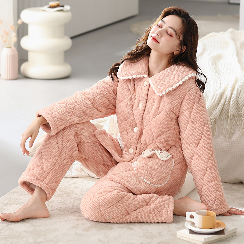 秋冬保温パジャマ女性カーディガン小香風三層厚手綿と長袖のズボンを合わせてパジャマを着ます。