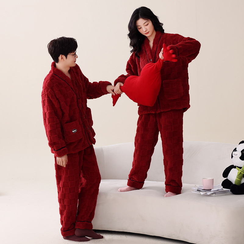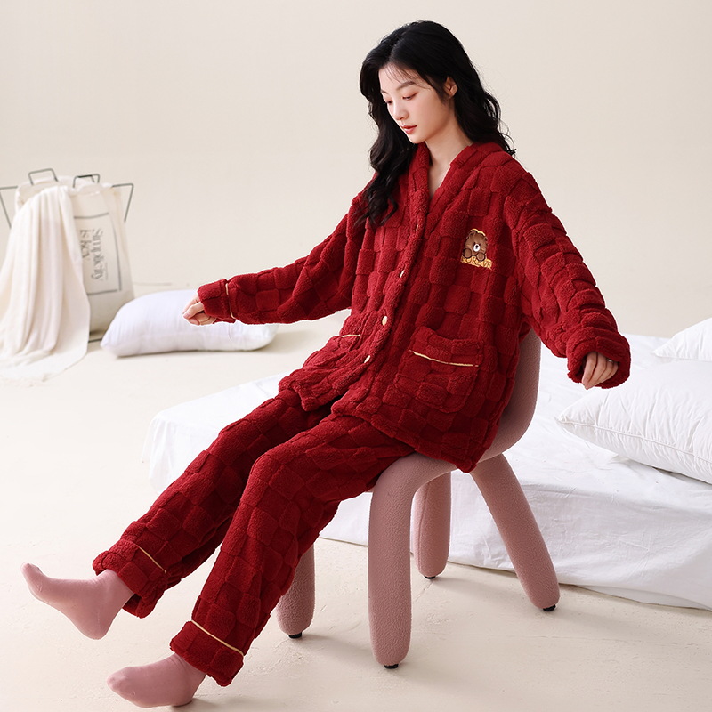 冬フランネルパジャマ女性カーディガン長袖大赤少女サンゴベルベット厚い保温家庭パジャマ