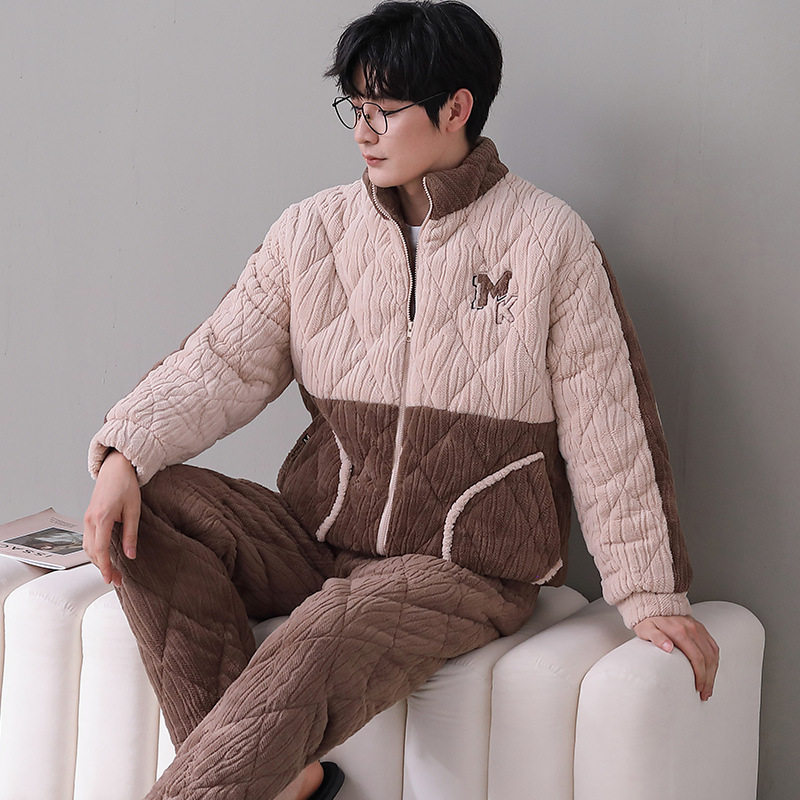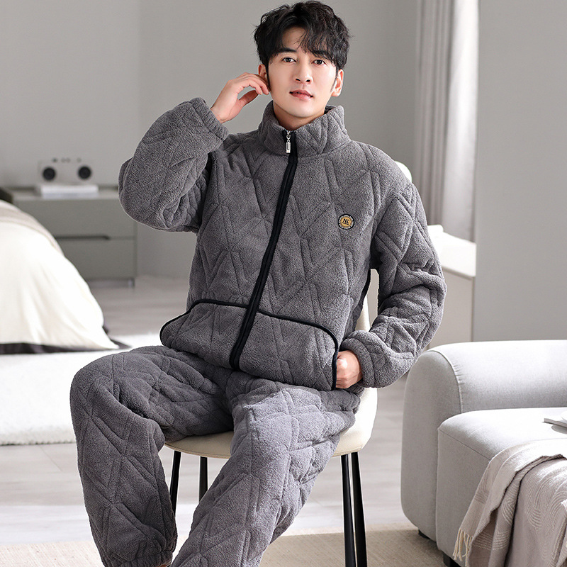ホテル風パジャマ男性立襟ジッパーお父さんサンゴベルベット冬パジャマ長袖三層厚さサンドイッチ綿