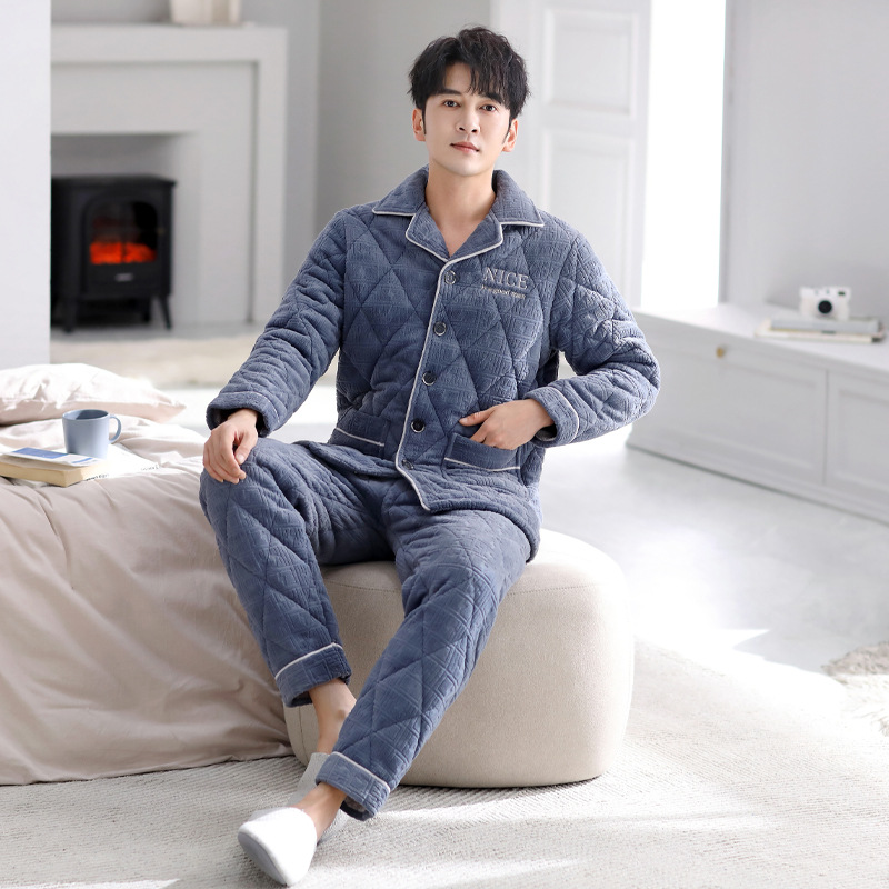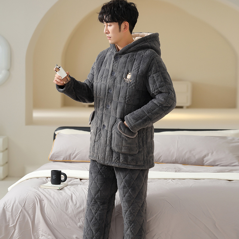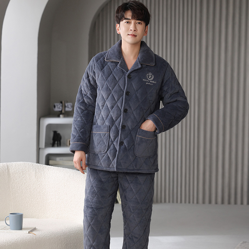 ベルベットパジャマ男性冬カーディガン純色刺繍三層厚手保温ジャケット男性長袖パジャマ