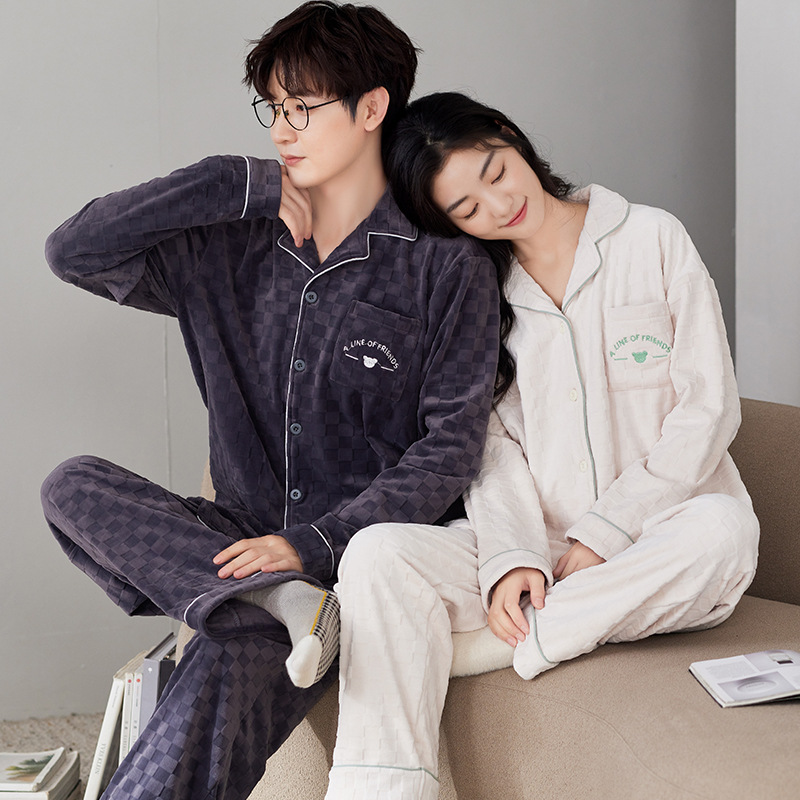 新婚カップルのパジャマ冬のカーディガンの長袖は暖かくて厚い海島の絨毛の純色の外はフランネルの家庭服を着ます。