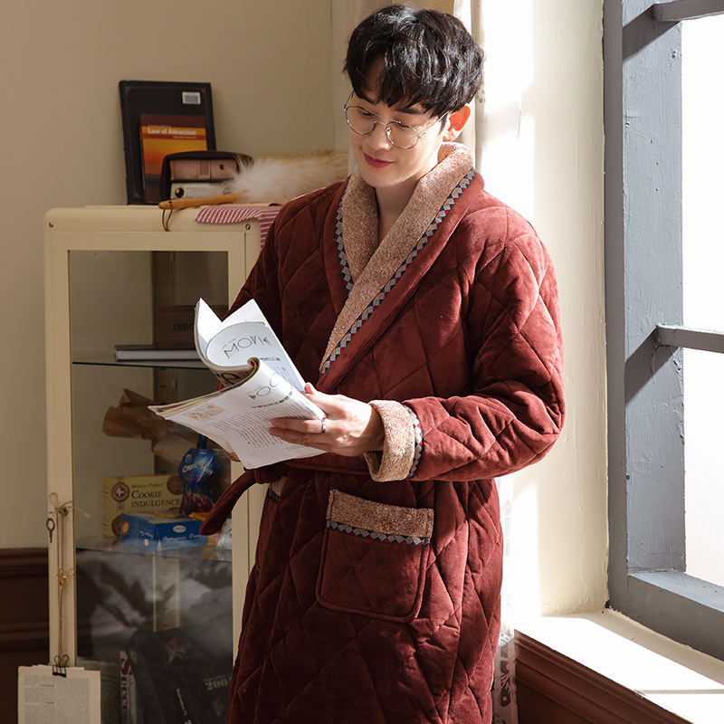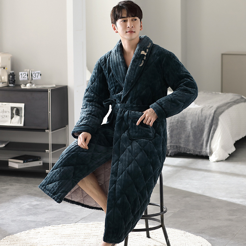 冬の寝衣の男性は長袖のコーラルの長いタイプのベルトの3層のサンドイッチをめくって厚い保温の男性の浴衣を持ちます。