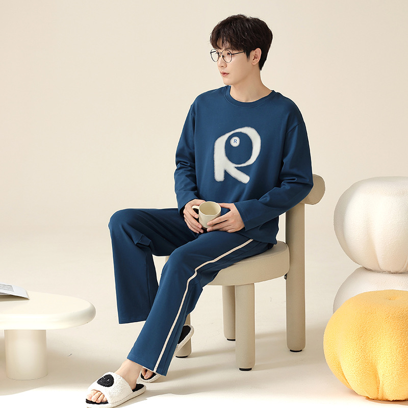 パジャマ男性丸襟長袖春秋男性爽やか綿韓国版シンプル長袖は家庭服パジャマを着ることができる