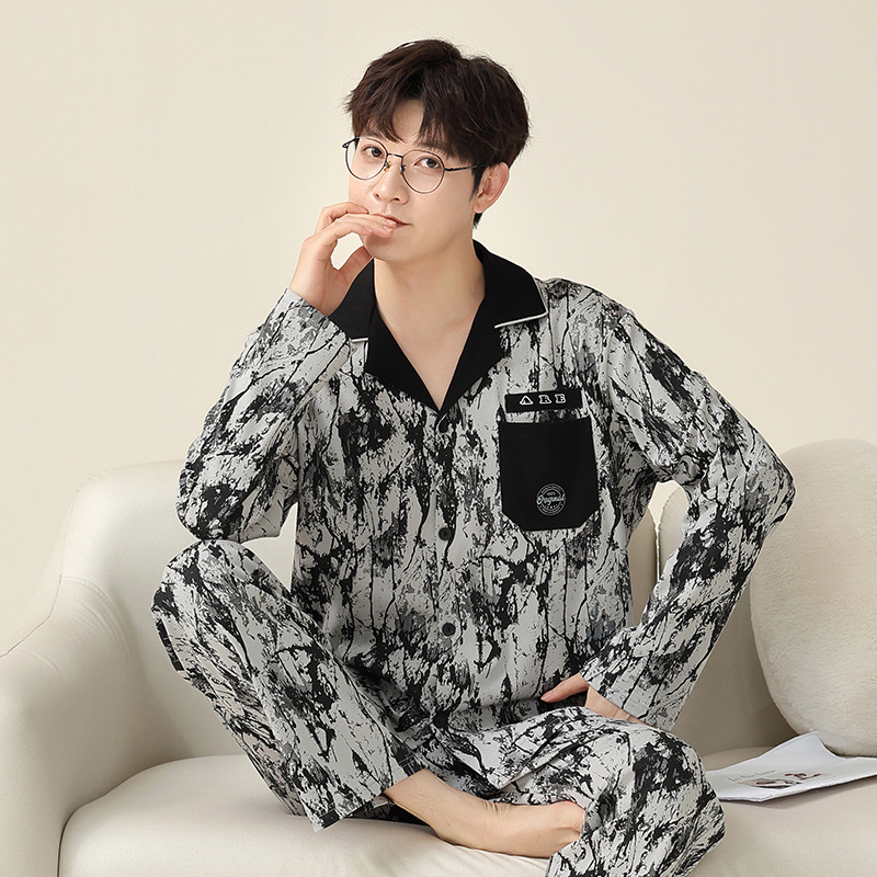 プルオーバー綿パジャマメンズ長袖春秋折り襟個性プリント爽やか綿秋アウターメンズホームウェア