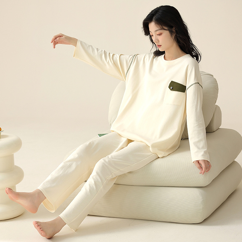 パジャマ女性丸襟長袖春秋シンプルでかわいい少女プルオーバー綿の外着家庭の爽やかなズボンパジャマ
