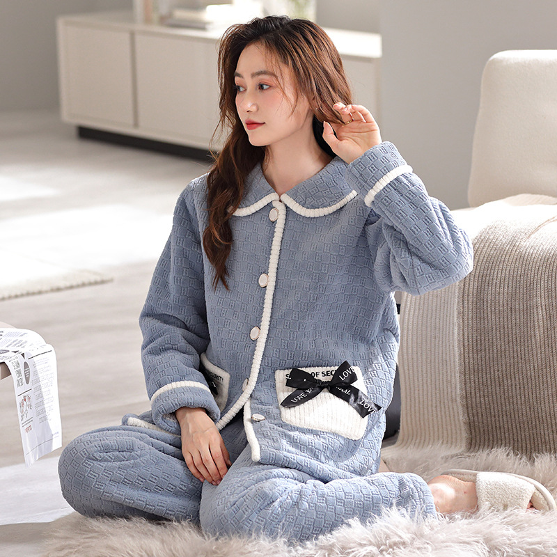 秋冬パジャマレディース三層合わせ保温厚手綿合わせ長袖長ズボン少女ホームウェアパジャマ
