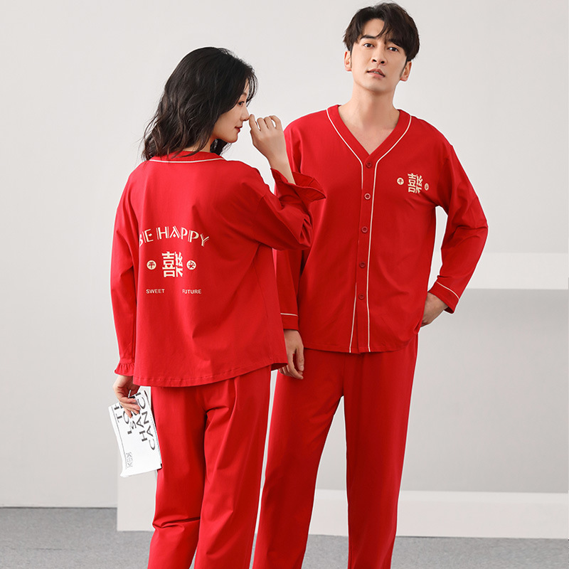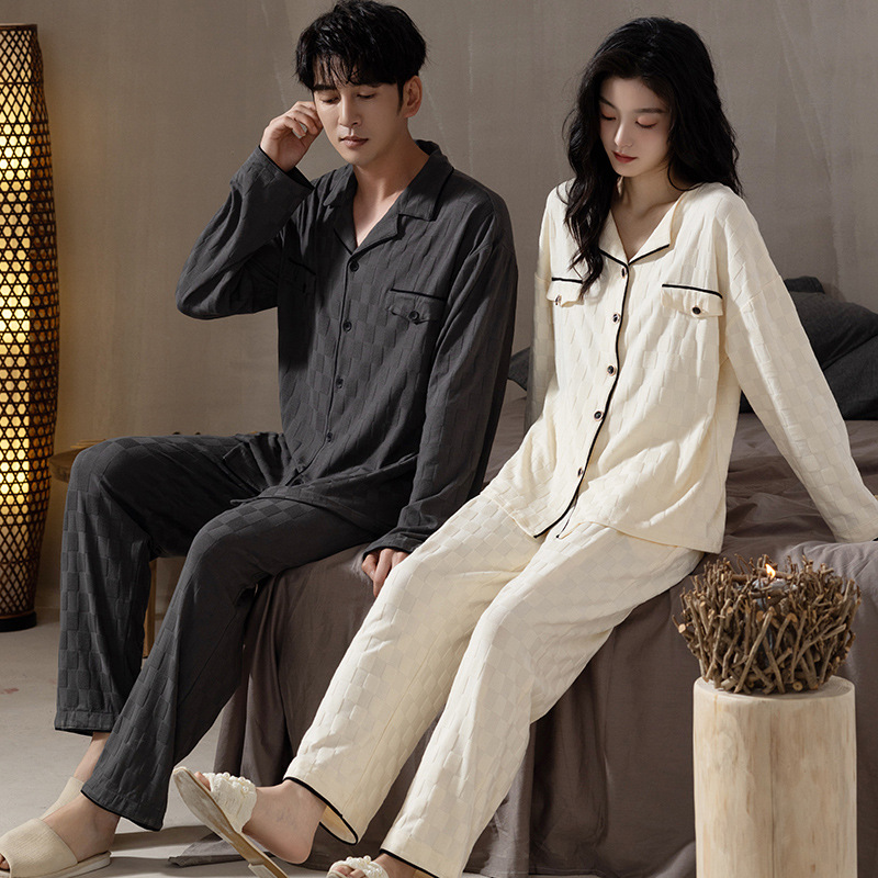 秋冬のカップルのパジャマ長袖韓国版カジュアルは襟を返して綿の薄い家庭服のパジャマセットを着ることができます。