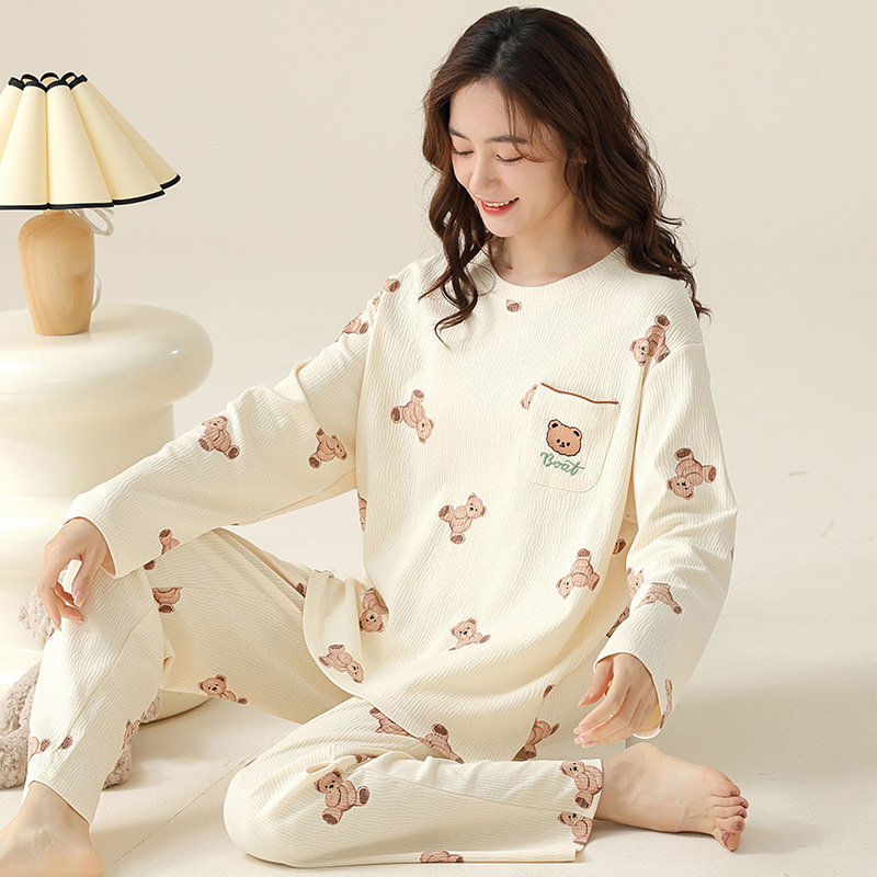 秋冬の丸首少女の家の服のパジャマは大きいサイズのモーダルの長袖のズボンのカード愛の熊のプリントのパジャマをプラスします。
