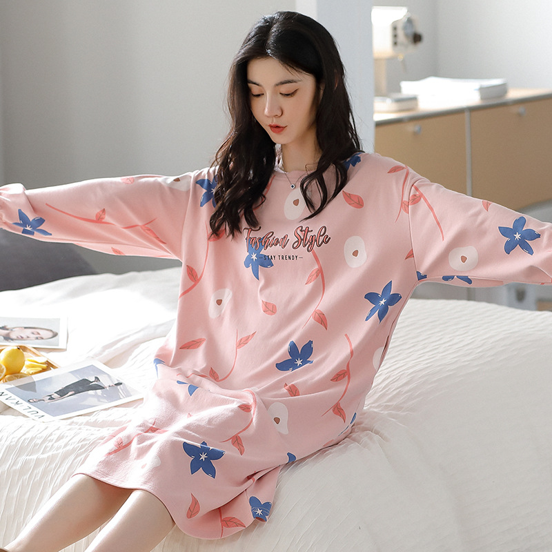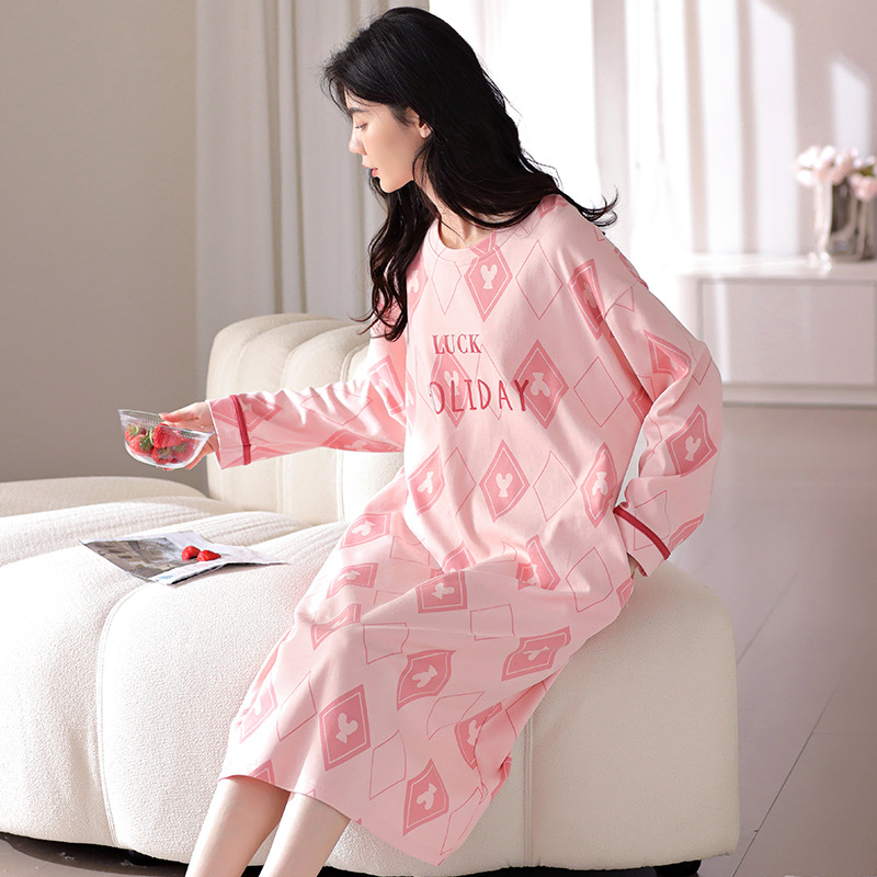 パジャマ女性韓国版かわいい少女丸首綿長袖ワンピース長型妊婦ホーム服ホテル寝スカート