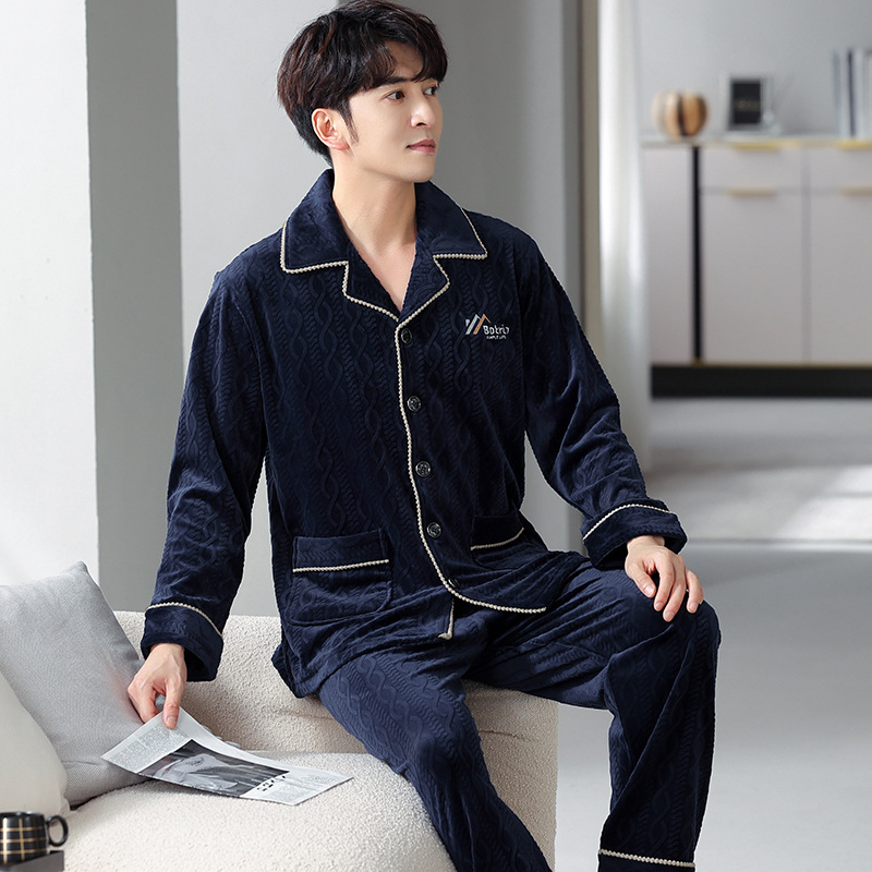 パジャマ男性冬複合パイルカーディガンゆるいベルベット厚い暖かいベルベット長袖ホームウェアパジャマ
