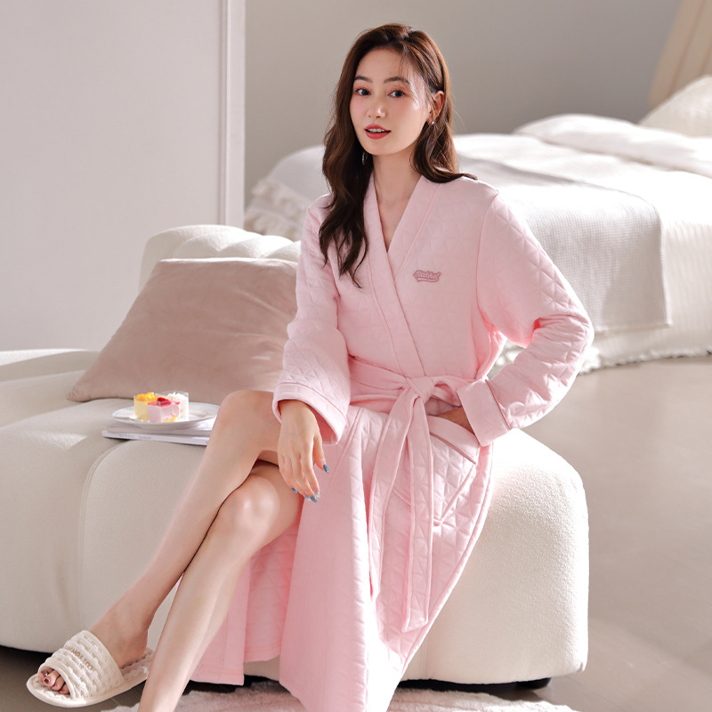 秋冬の女性の寝衣の長いカーディガンの純色は腰の縄の3層の厚い綿のホテルのバスローブの家庭の朝の服を持ちます。