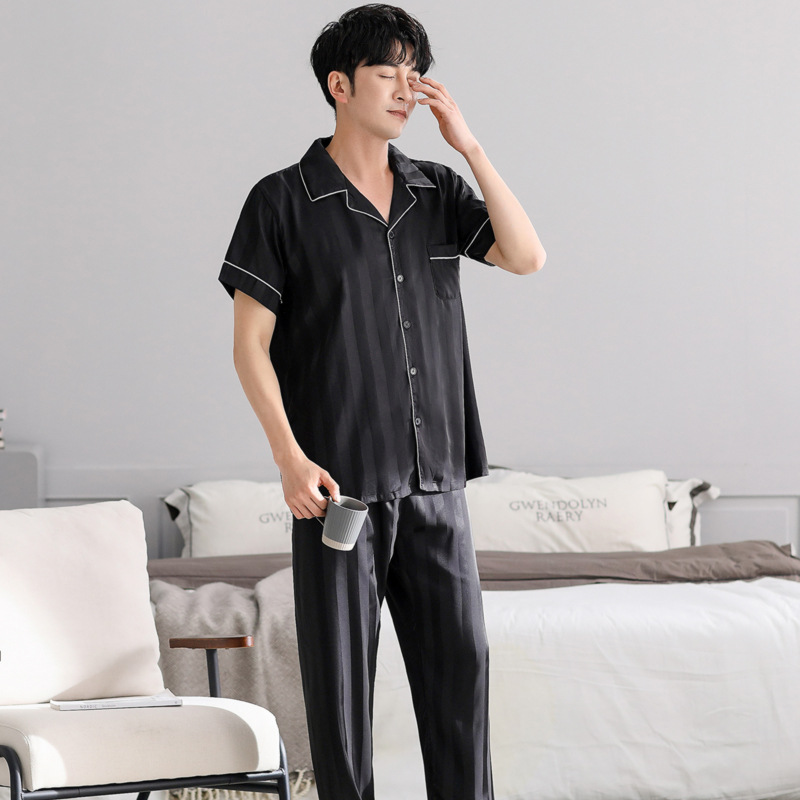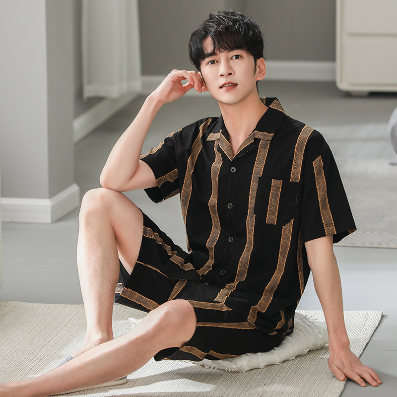 ティレ夢夏パジャマ男半袖外着ストライププリント襟付きホームモーダルショートパンツパジャマセット