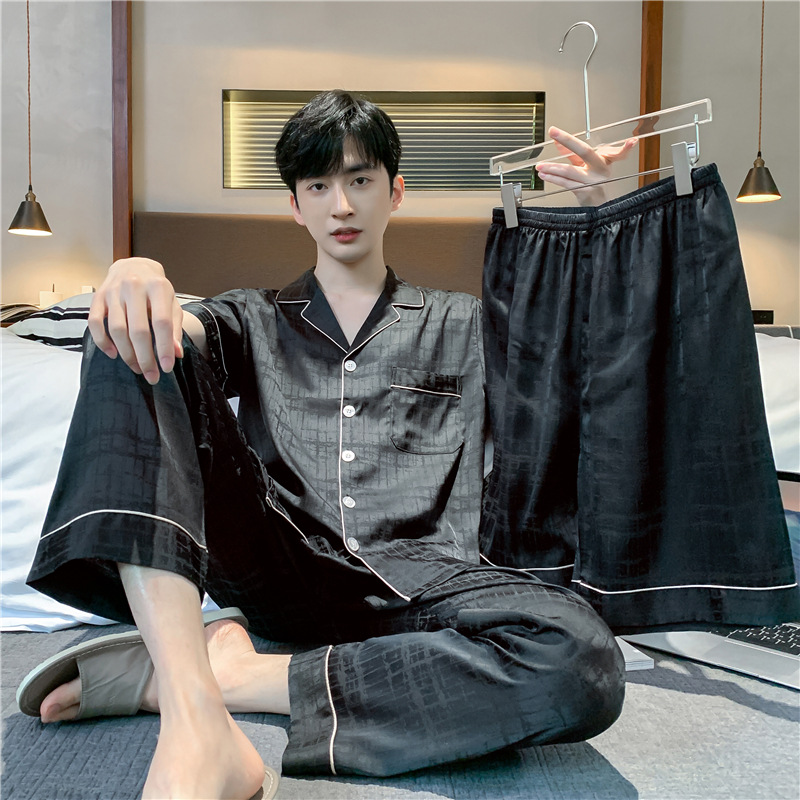 ティレ夢春秋新作カーディガン薄手半袖アイスホーム男性外着ショートパンツ長ズボン三点セットパジャマ