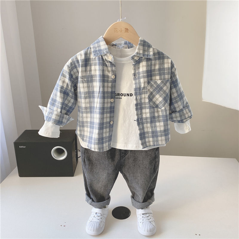 男の子の青い格子の長袖のシャツの2025秋の服の新型の春秋の子供のシャツの子供の潮の赤ちゃんの上着のコート