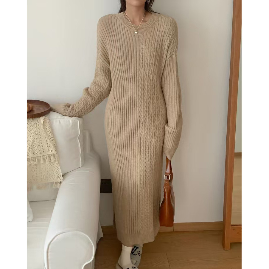 坑条麻花毛スカート秋冬高級感クロスボーダー丸首純色欧米新型外国貿易ニットワンピース女性